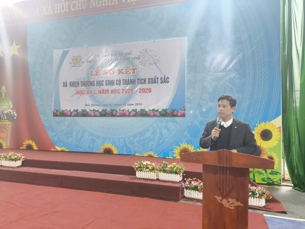Phát biểu tại buổi lễ, Thầy giáo Vũ Ngọc Hân - Hiệu trưởng nhà trường đã ghi nhận và biểu dương những nỗ lực, cố gắng của tập thể cán bộ, giáo viên và học sinh trong suốt học kỳ I. Thầy giáo đã nhấn mạnh, những kết quả đạt được là tiền đề quan trọng để nhà trường tiếp tục nâng cao chất lượng giáo dục trong học kỳ II, đồng thời đề nghị thầy và trò nhà trường tiếp tục phát huy tinh thần trách nhiệm, đổi mới phương pháp dạy và học, tăng cường kỷ cương, nề nếp, phấn đấu hoàn thành tốt nhiệm vụ năm học 2025–2026.